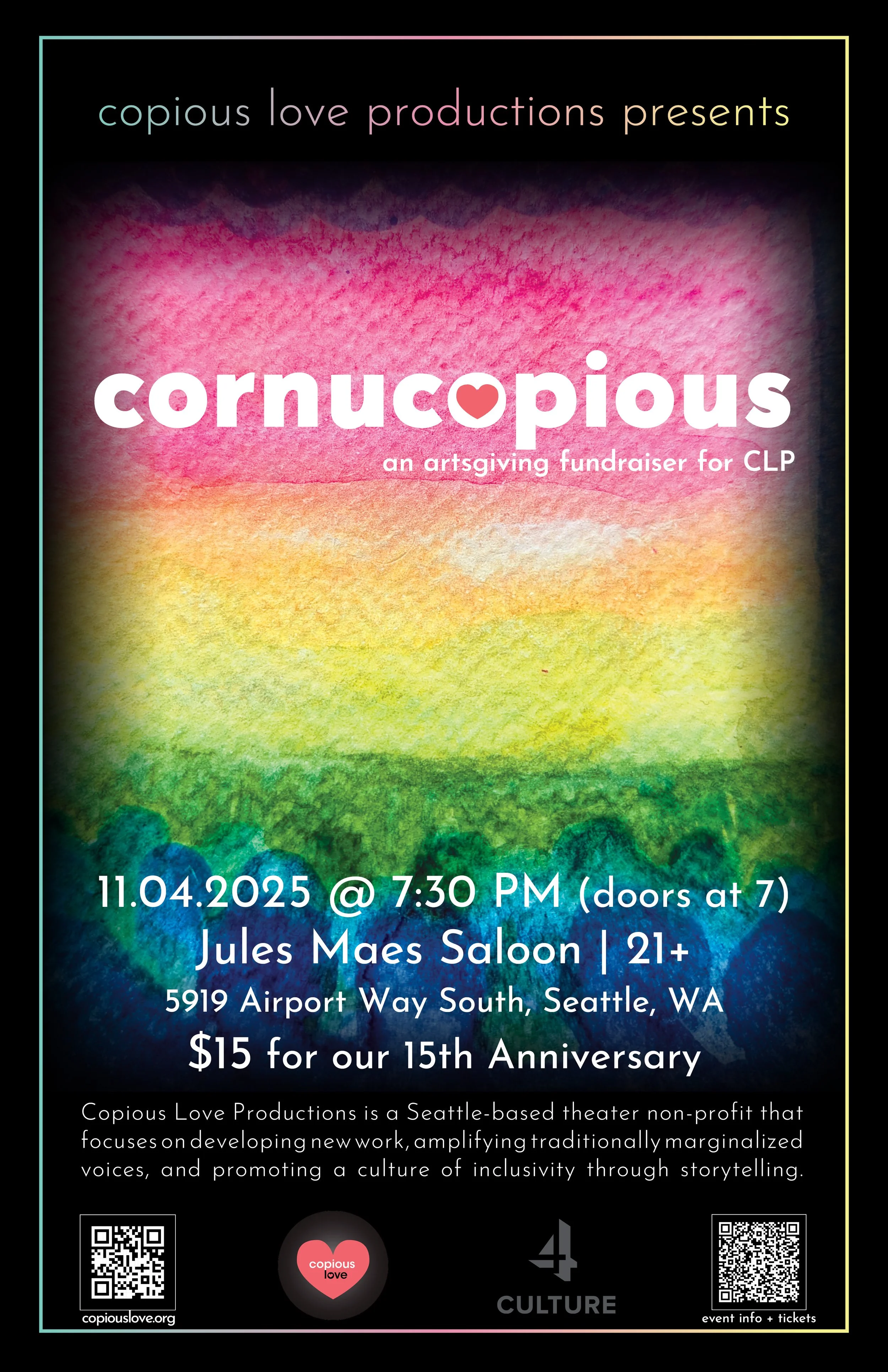 The start of a new theatrical holiday tradition! Inspired by the theme “Comfort Food,” this festive evening features brand-new short works from an eclectic lineup of Seattle-based artists—plus raffle prizes, snacks, and a few surprises (including a peek at what’s coming in 2026!). Celebrate Copious Love’s 15th year with us and help shape the future of local theatre.